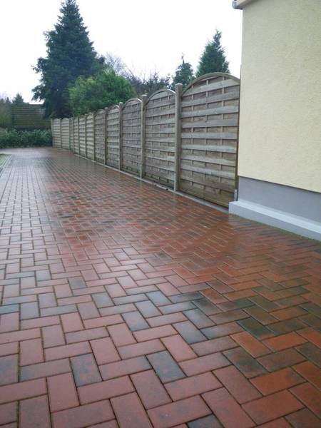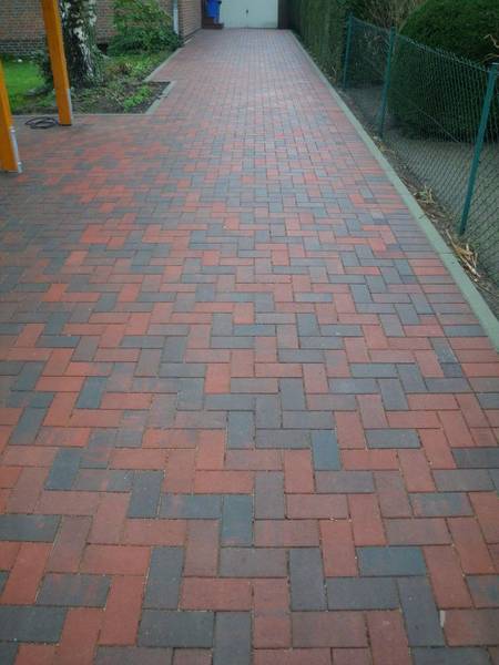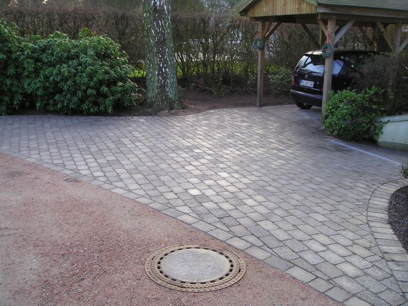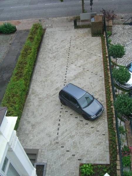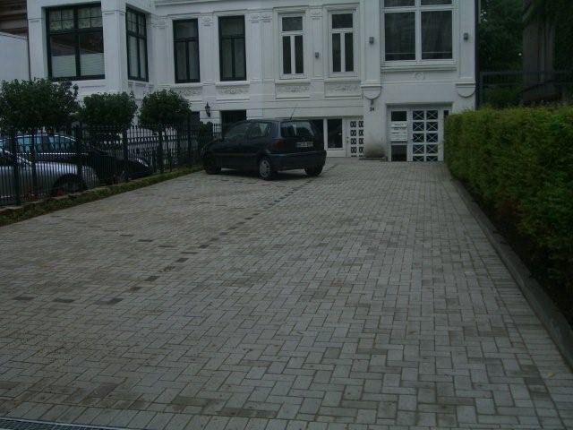 Betonsteinpflaster aus Belgien, eingerahmt von Porphyr-Kleinpflaster