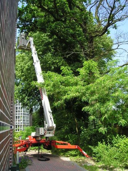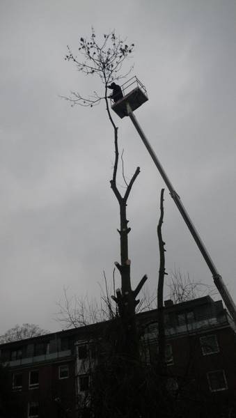 Durch den Einsatz des Hubsteigers ist das stückweise Abtragen des Baumes gefahrlos möglich